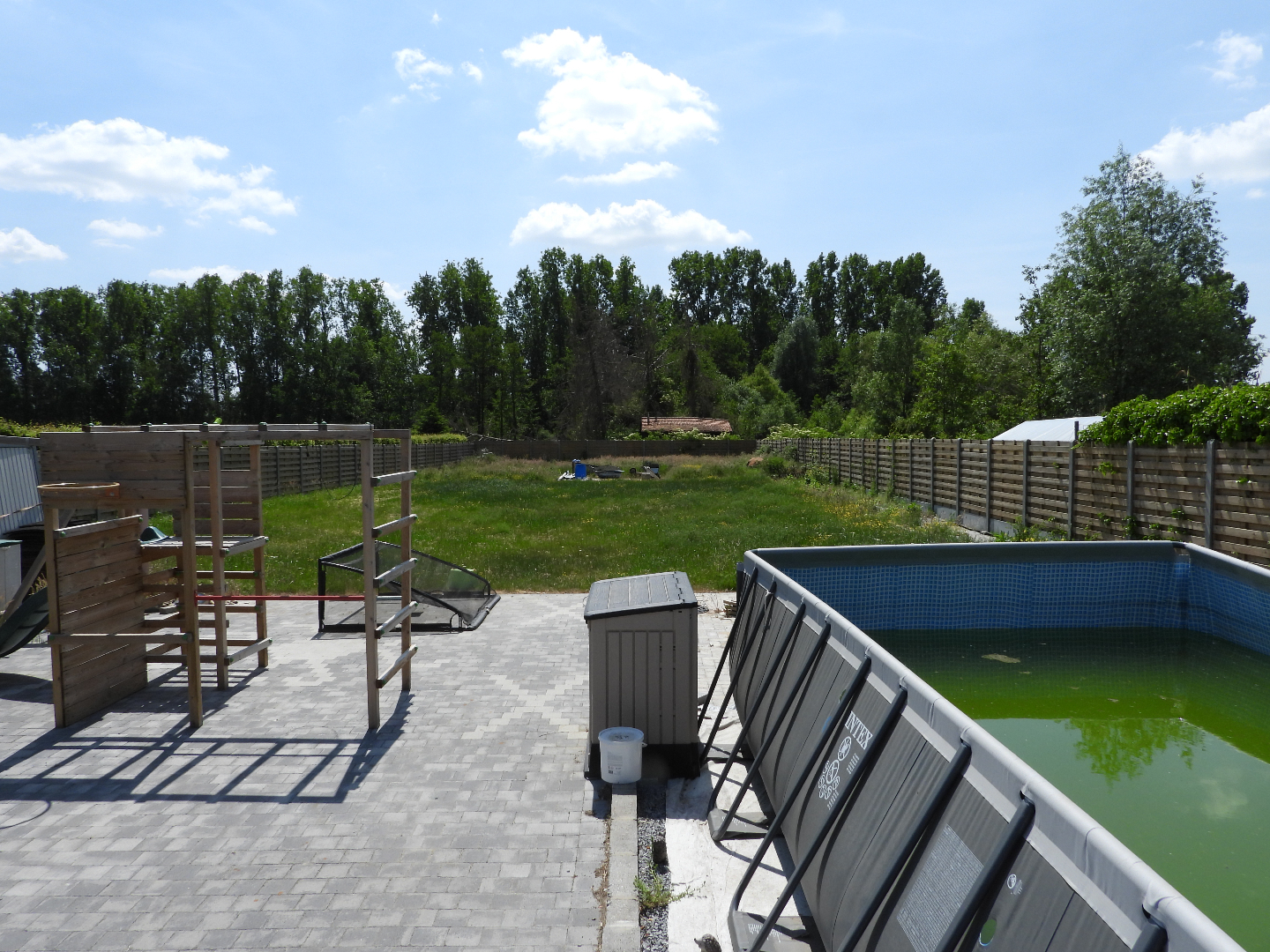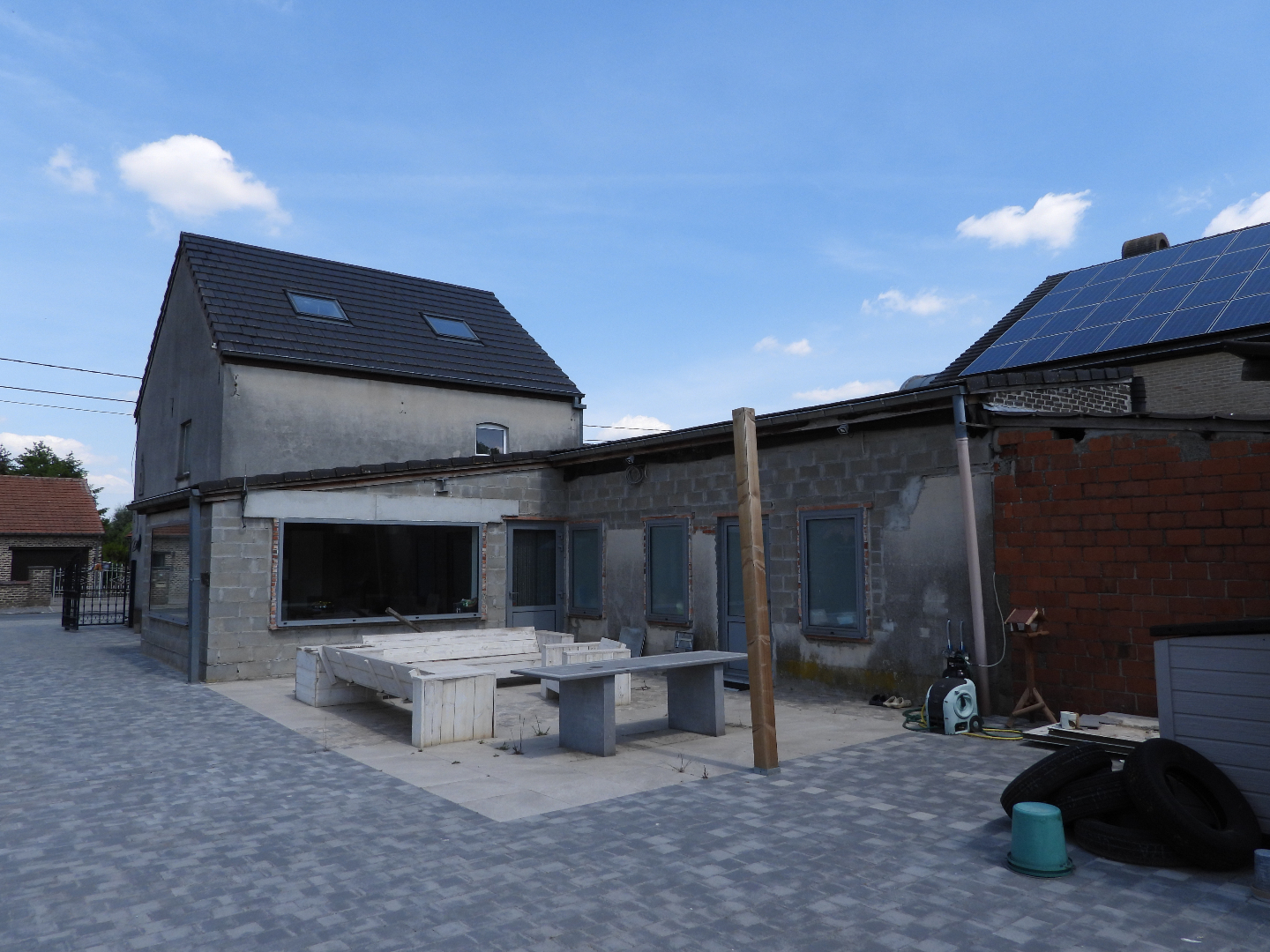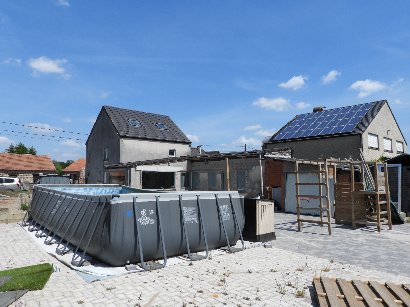 Indeling woning : living-eetplaats, bureel, keuken, wc, berging, op verdiep drie slaapkamers, badkamer, zolder, volledig afgesloten tuin, zwembad, twee terrassen en mogelijkheid om verhoogd derde terras af te werken
