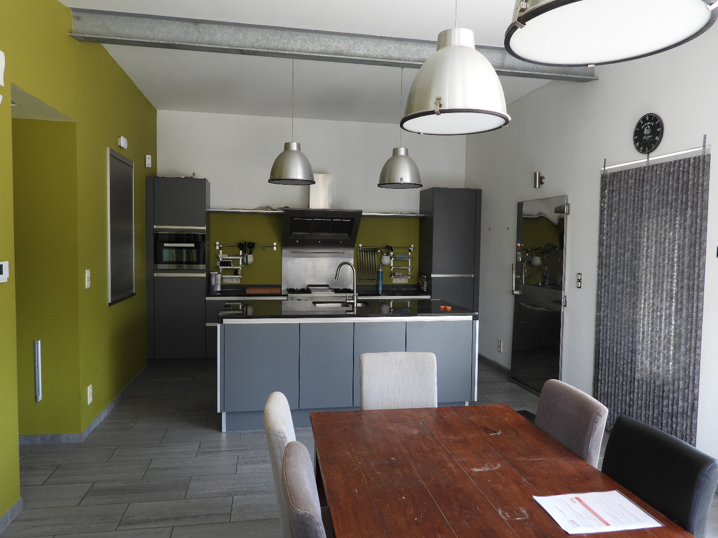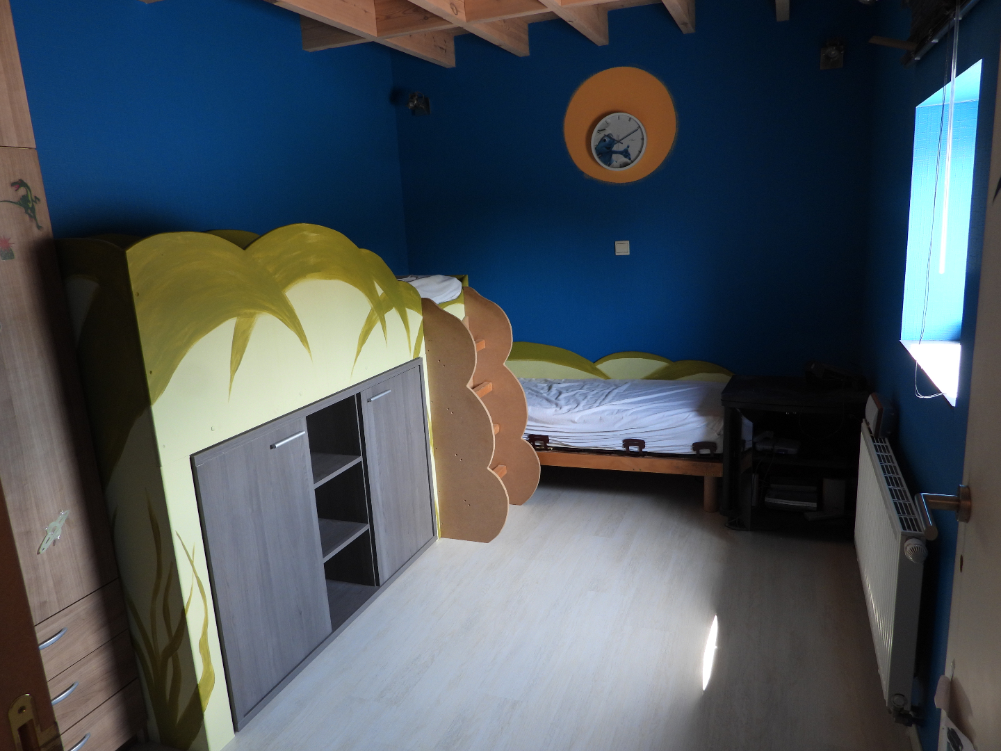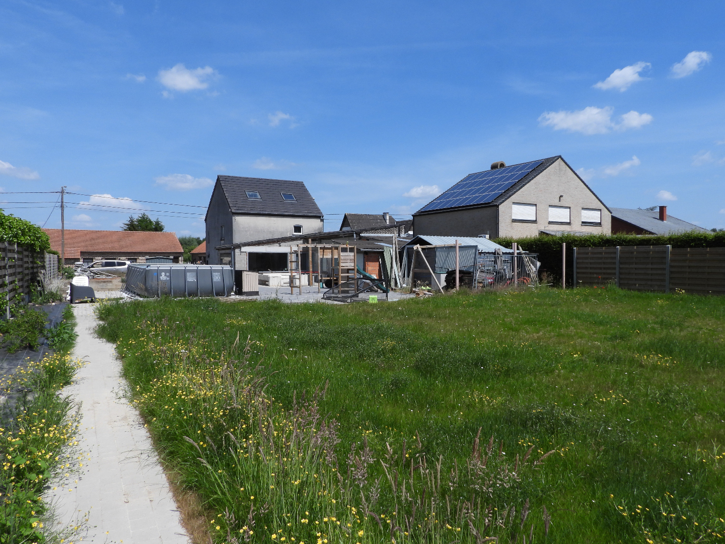 Indeling woning : living-eetplaats, bureel, keuken, wc, berging, op verdiep drie slaapkamers, badkamer, zolder, volledig afgesloten tuin, zwembad, twee terrassen en mogelijkheid om verhoogd derde terras af te werken